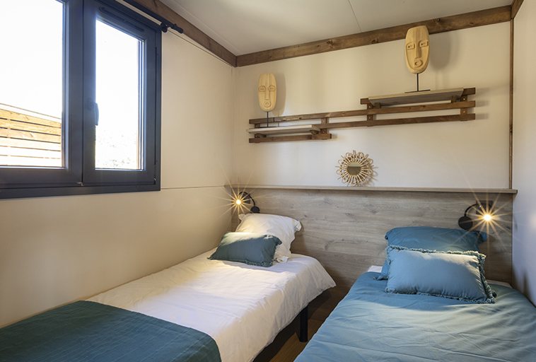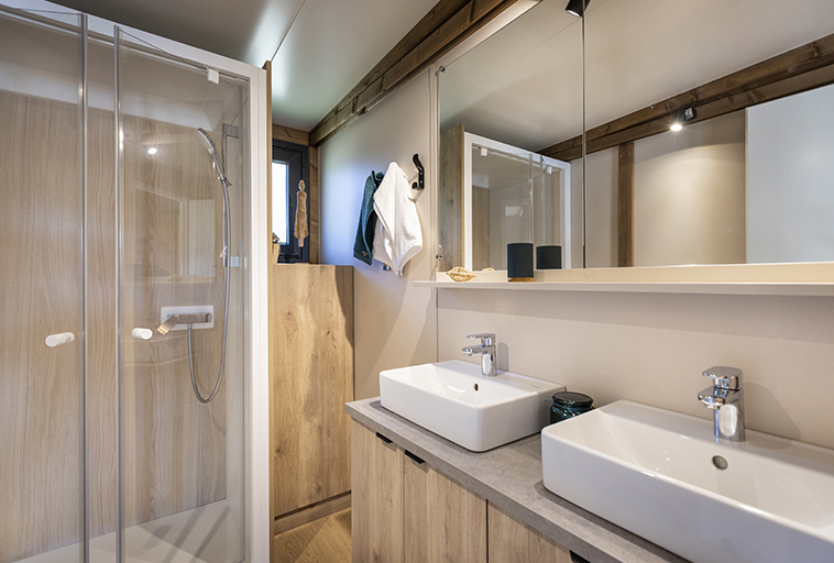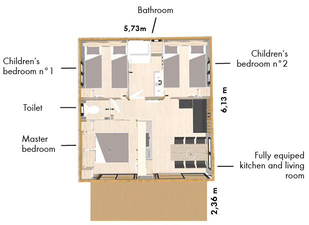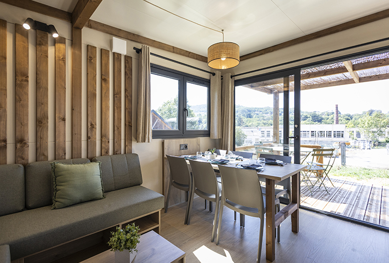 Grundmodellen af Mobilhome Moderne Mobilhome for optil 5 personer med køkken og udendørs terrasse